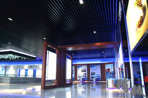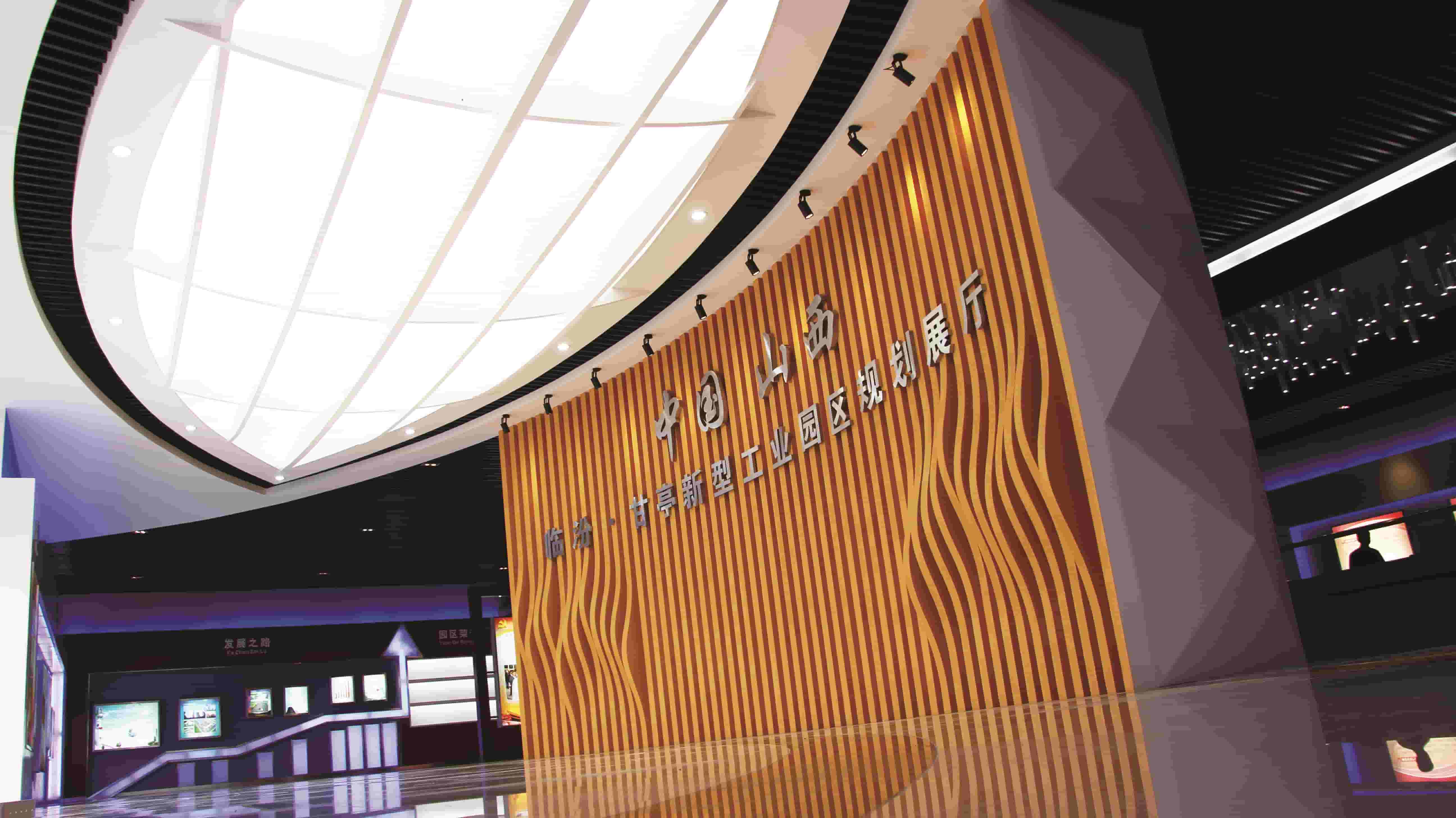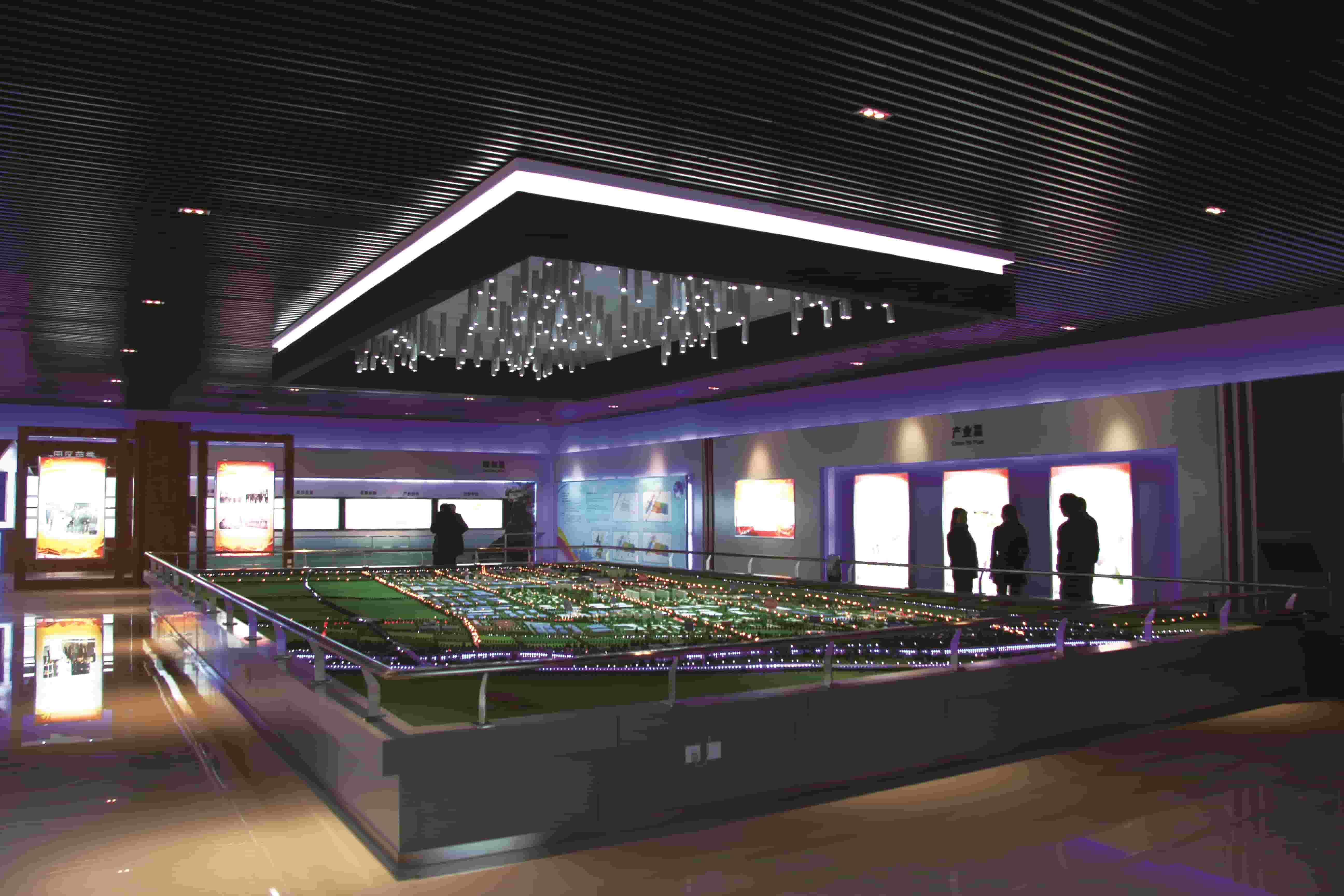 臨汾·甘亭新型工業(yè)園區(qū)規(guī)劃展覽館的展廳運(yùn)用藍(lán)色作為展廳環(huán)境色,體現(xiàn)新型工業(yè)園區(qū)的科技感。具有生命力的波浪狀向上推進(jìn)企業(yè)形象墻,沙盤頂部的概念性吊頂裝飾,和黑色鏡面點(diǎn)綴的展墻,營造了良好的視覺效果,同時(shí)也體現(xiàn)了園區(qū)飛速發(fā)展的美好愿景。