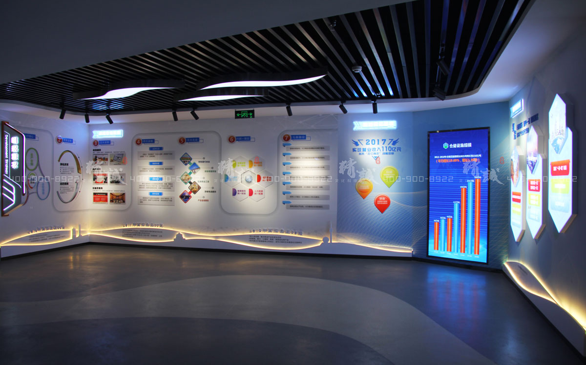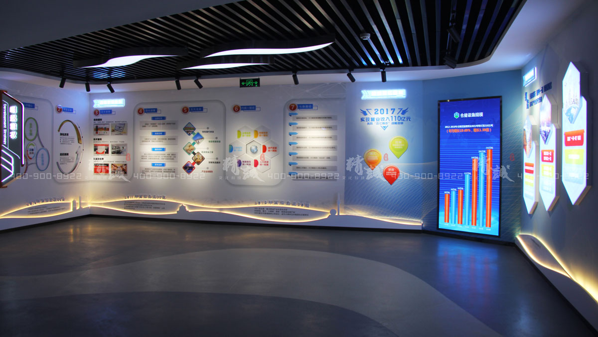 該板塊采用墻面圖文展板+多媒體顯示屏,并結(jié)合細節(jié)化背發(fā)光式場景墻面裝飾,以頂墻地三面結(jié)合的畫面形式,對集團的發(fā)展、榮譽進行展示,達到視覺的豐富感和連貫性。