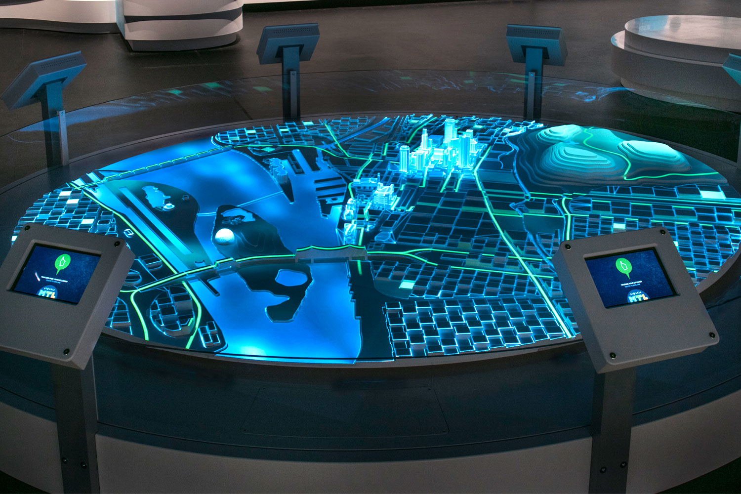數(shù)字沙盤早已突破“只觀看"層面上的限制,通過三維影像與交互設計,可融入互動功能,不管是通過點擊查詢更詳細的信息內容,還是通過人體動作設定展示特定圖像與參觀者產生互動,增加其趣味性。