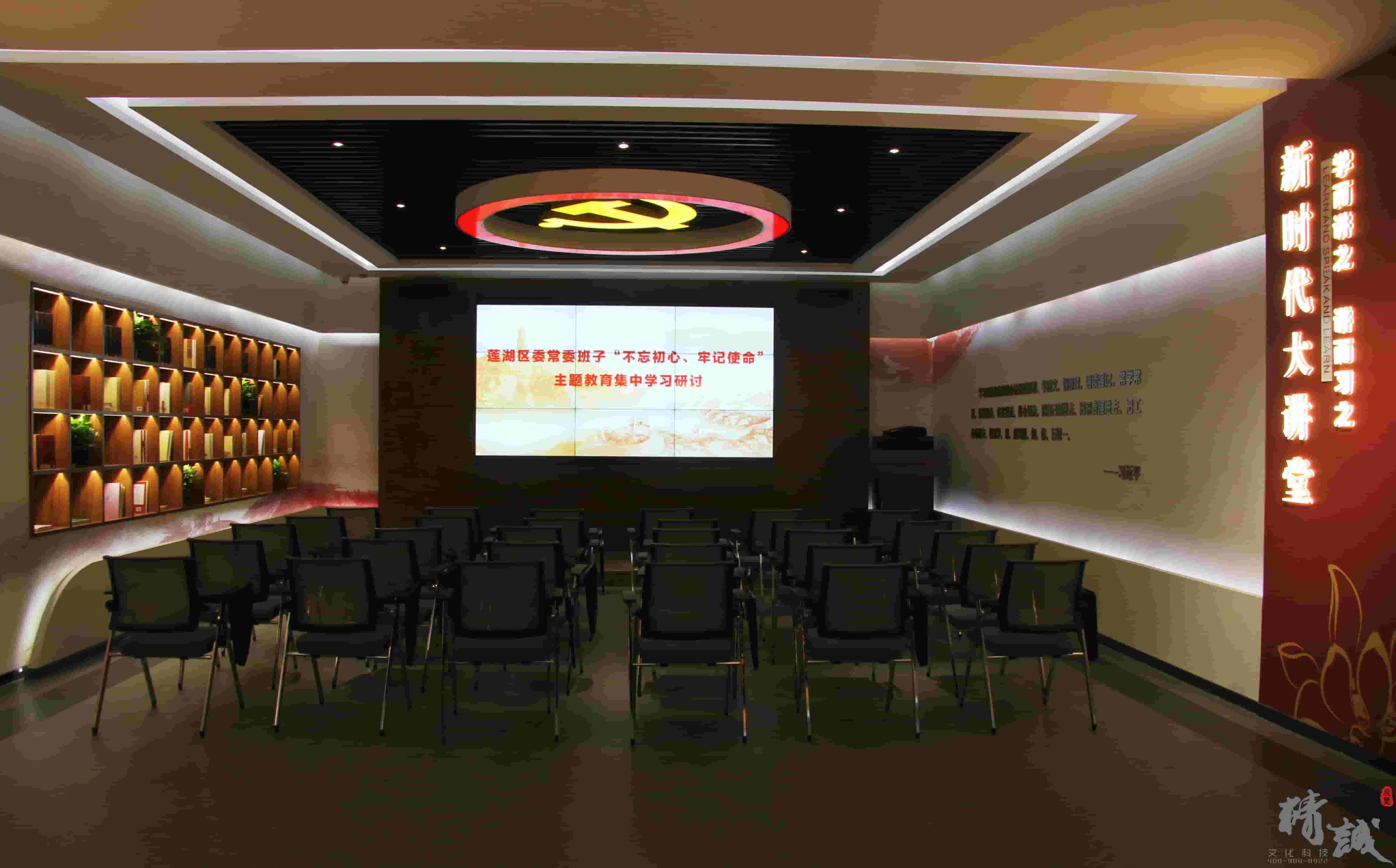 以“學(xué)而講之、講而習(xí)之”為主題,作為黨員干部開(kāi)展新時(shí)代中國(guó)特色社會(huì)主義思想學(xué)習(xí)的陣地,黨員學(xué)習(xí)之后,在此開(kāi)展自評(píng)、互評(píng),亦可以邀請(qǐng)書(shū)記、專(zhuān)家、黨代表授課。此空間設(shè)置講臺(tái)、座椅及用于授課的拼接大屏,吊頂采用巨型黨徽,簡(jiǎn)約又不失大氣。左側(cè)墻壁內(nèi)嵌式書(shū)架擺放黨建讀物,黨員干部可自行閱覽學(xué)習(xí),右側(cè)墻壁摘錄中國(guó)共產(chǎn)黨黨員教育管理?xiàng)l例內(nèi)容,和大講堂黨員教育性質(zhì)相呼應(yīng)。
