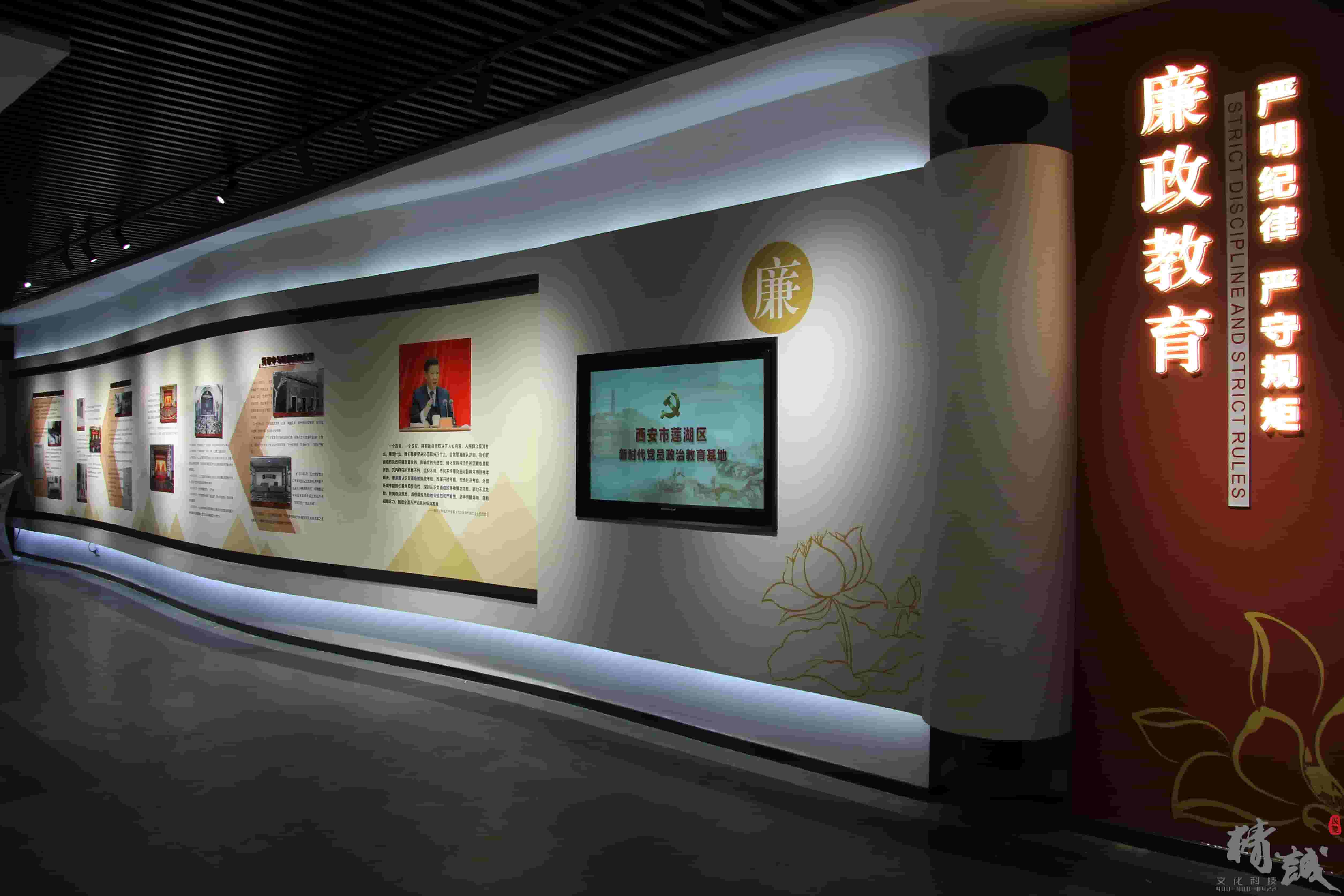 以畫(huà)軸的展現(xiàn)形式展示習(xí)近平總書(shū)記全面從嚴(yán)治黨重要論述,將廉政建設(shè)的重要性和意義娓娓道來(lái),液晶顯示屏播放廉政教育相關(guān)視頻,注重從嚴(yán)治黨的正面宣傳,加強(qiáng)黨員干部的廉政作風(fēng)。