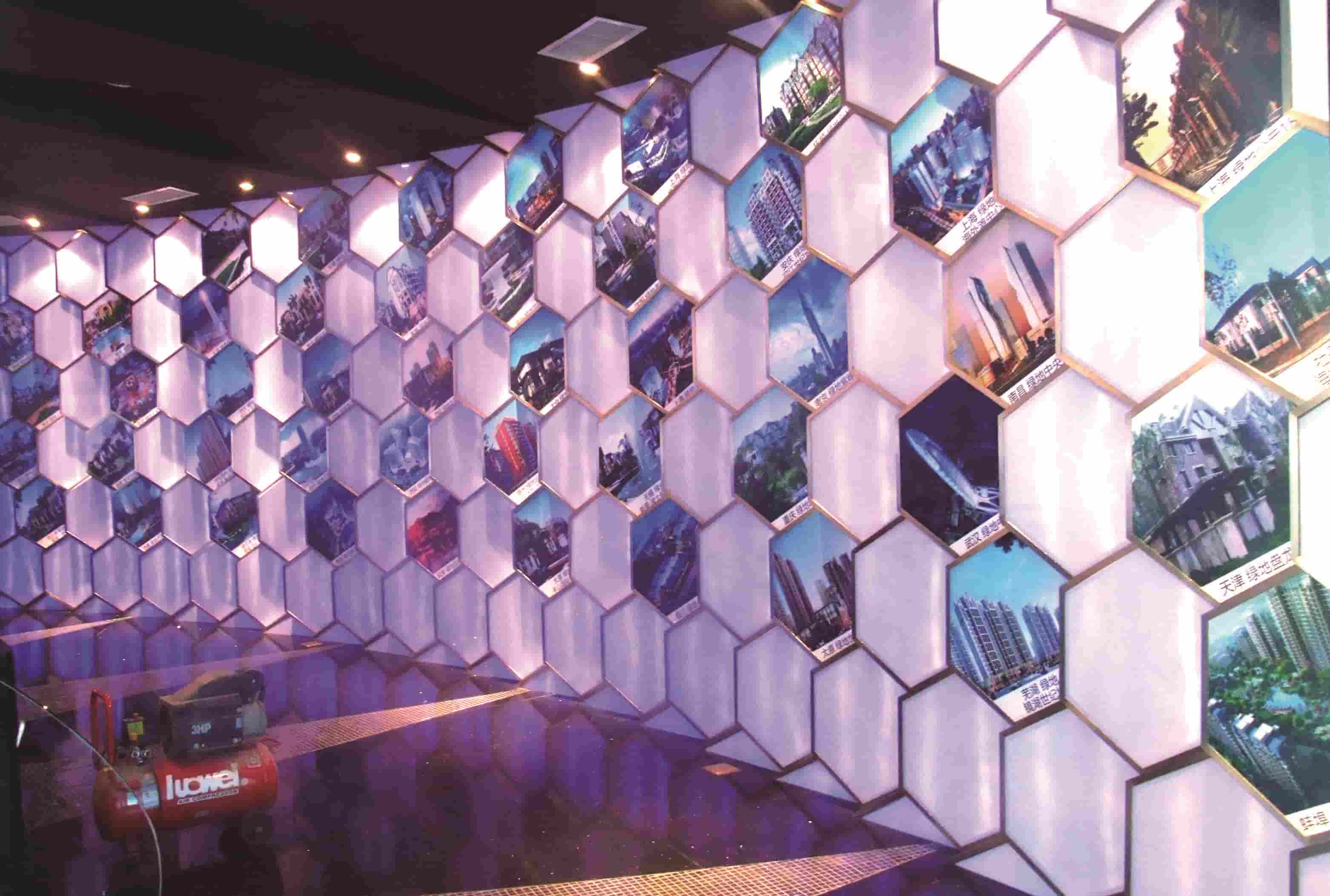 并且這個主要利用在現(xiàn)代裝飾風(fēng)格中融入生態(tài)元素,突顯生態(tài)館理念。區(qū)別于常規(guī)整體墻面造型,利用高低錯落有序的獨(dú)立墻體設(shè)計(jì),使整個弧形墻面更加富有層次感;利用蜂巢狀的陣列造型,讓墻面顯得更加自然、生動。而藍(lán)色燈光的合理運(yùn)用,讓展廳在視覺效果上更加富有科技感。