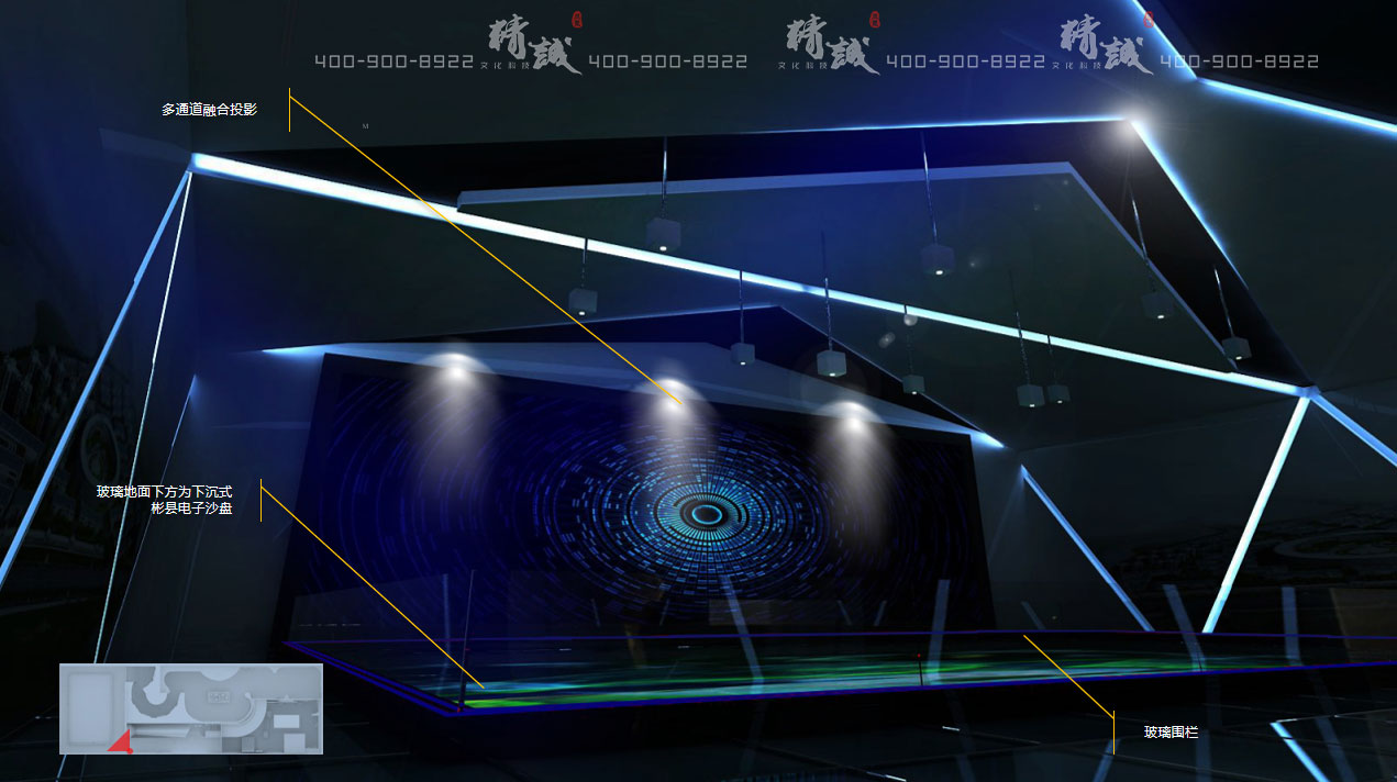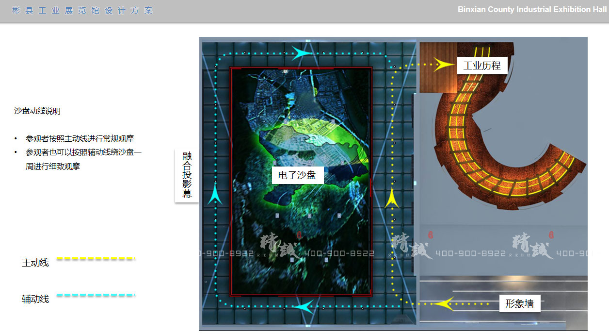 沙盤:大型下沉式多通道投影電子沙盤,配合墻面投影播放的宣傳片,立體展示彬縣概況、人文歷史、工業(yè)歷程、園區(qū)規(guī)劃、產業(yè)轉型、優(yōu)質產品、未來展望等內容,時長約5分鐘。
