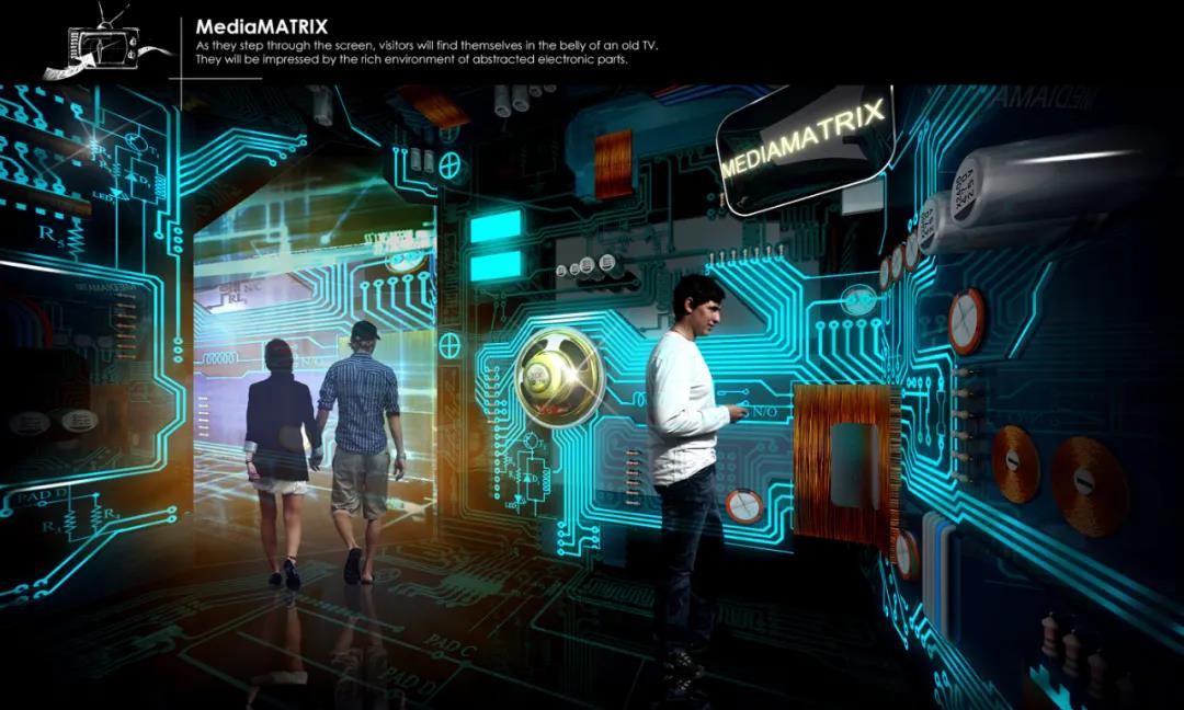 媒體矩陣:當參觀者走過屏幕時,他們會發(fā)現(xiàn)自己置身于一臺舊電視里,他們將會被抽象的電子部件所構成的豐富環(huán)境所震撼。