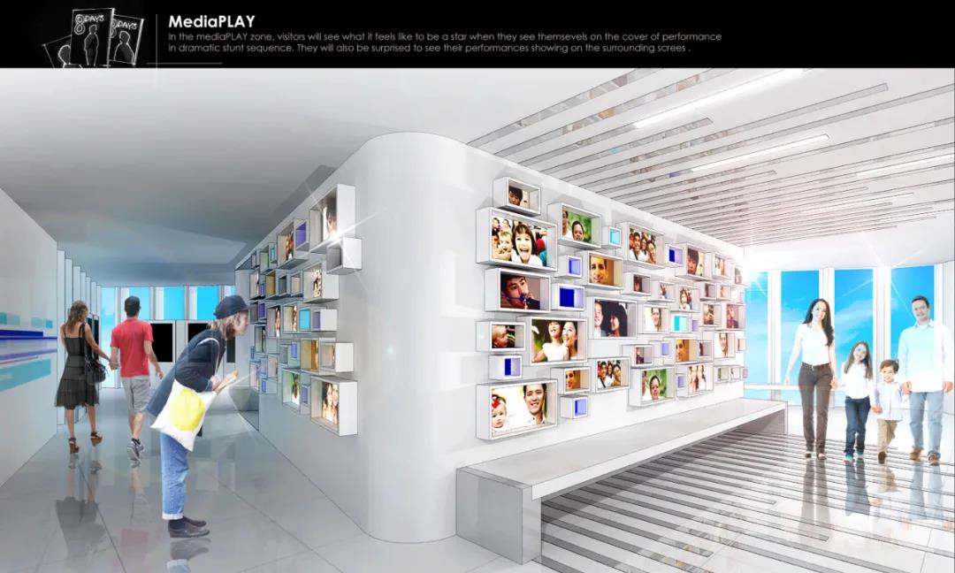 媒體播放區(qū):在“媒體播放區(qū)”,游客們會看到自己出現(xiàn)在《表演與特技》的封面上時,感覺就像一個明星,他們也會驚訝地看到他們的表演在周圍的屏幕上。