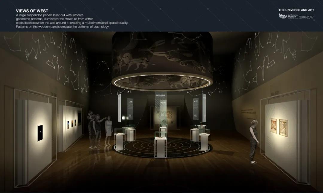 精誠展覽的觀點:一個巨大的懸空面板,由激光切割而成,錯綜復雜幾何圖案,從內(nèi)部照亮了建筑它的影子投射在周圍的墻上,創(chuàng)造了一個多維的空間品質(zhì)。木板上的圖案模仿了宇宙學的圖案。