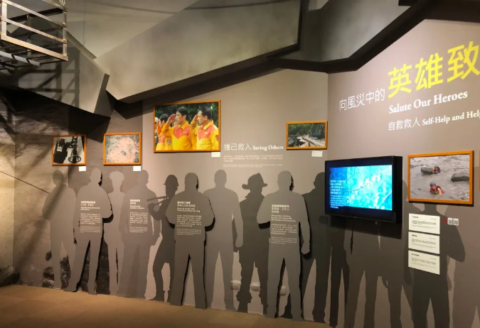 救援部隊英雄:這里人物造景采用了虛實(shí)結(jié)合的方式,虛的人物部分與畫面背景融合,統(tǒng)一油畫布畫面打印,實(shí)的人物部分是雪弗板UV雕刻打印,采用灰色調(diào)的背景人物形象,隱形表達(dá)這些是已經(jīng)逝去的救援英雄,墻面彩色的照片框展示的是英雄們英勇救援的場景,色彩上的強(qiáng)烈對比,烘托出悲壯的環(huán)境藝術(shù)氛圍