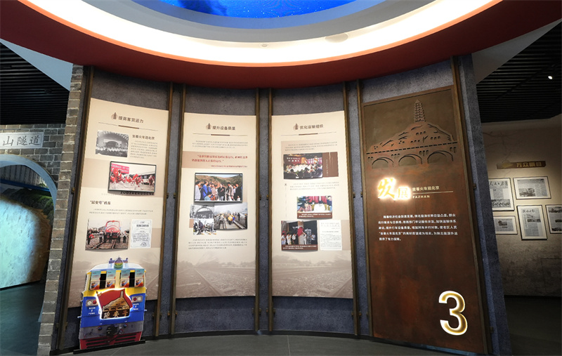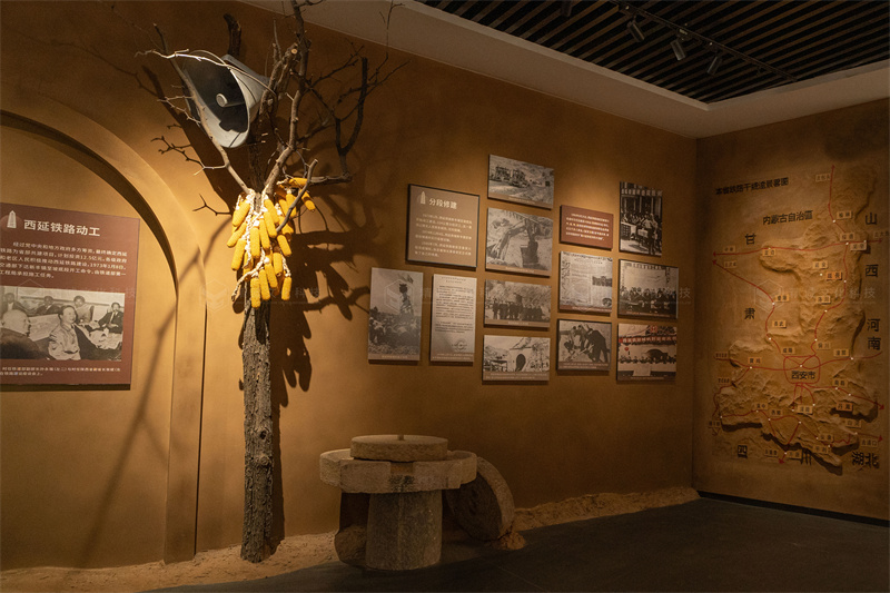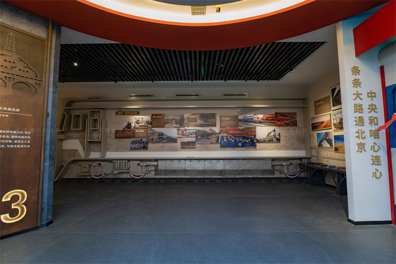 展示標(biāo)題上,采用當(dāng)?shù)亓鱾鞯蔫F路民謠進(jìn)行編織,將其劃分成“筑路?中央和咱心連心”“圓夢(mèng)?火車(chē)開(kāi)到寶塔山”“發(fā)展?坐上火車(chē)逛北京”“騰飛?巨龍馳騁譜新篇”四大版塊,以全方位展現(xiàn)陜北鐵路從規(guī)劃、建設(shè)到發(fā)展壯大的歷史進(jìn)程,進(jìn)而生動(dòng)反映陜北鐵路取得的突出成就及對(duì)陜北革命老區(qū)經(jīng)濟(jì)社會(huì)發(fā)展的推動(dòng)作用。