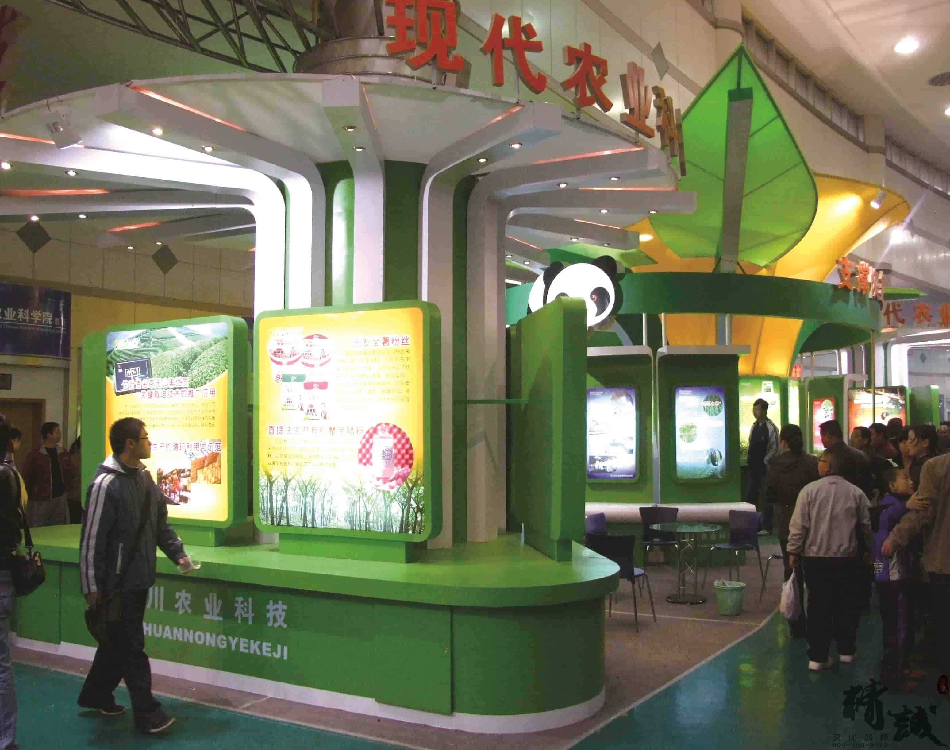 展位設計以綠色為主色,體現(xiàn)出四川綠色生態(tài)的現(xiàn)代農業(yè);恰當?shù)恼古_設計,便于特色產品的展示;“國寶”熊貓雕刻畫裝飾,使得展位賦予了活潑與動態(tài)感。整個展位突顯了四川的綠色、生態(tài)。