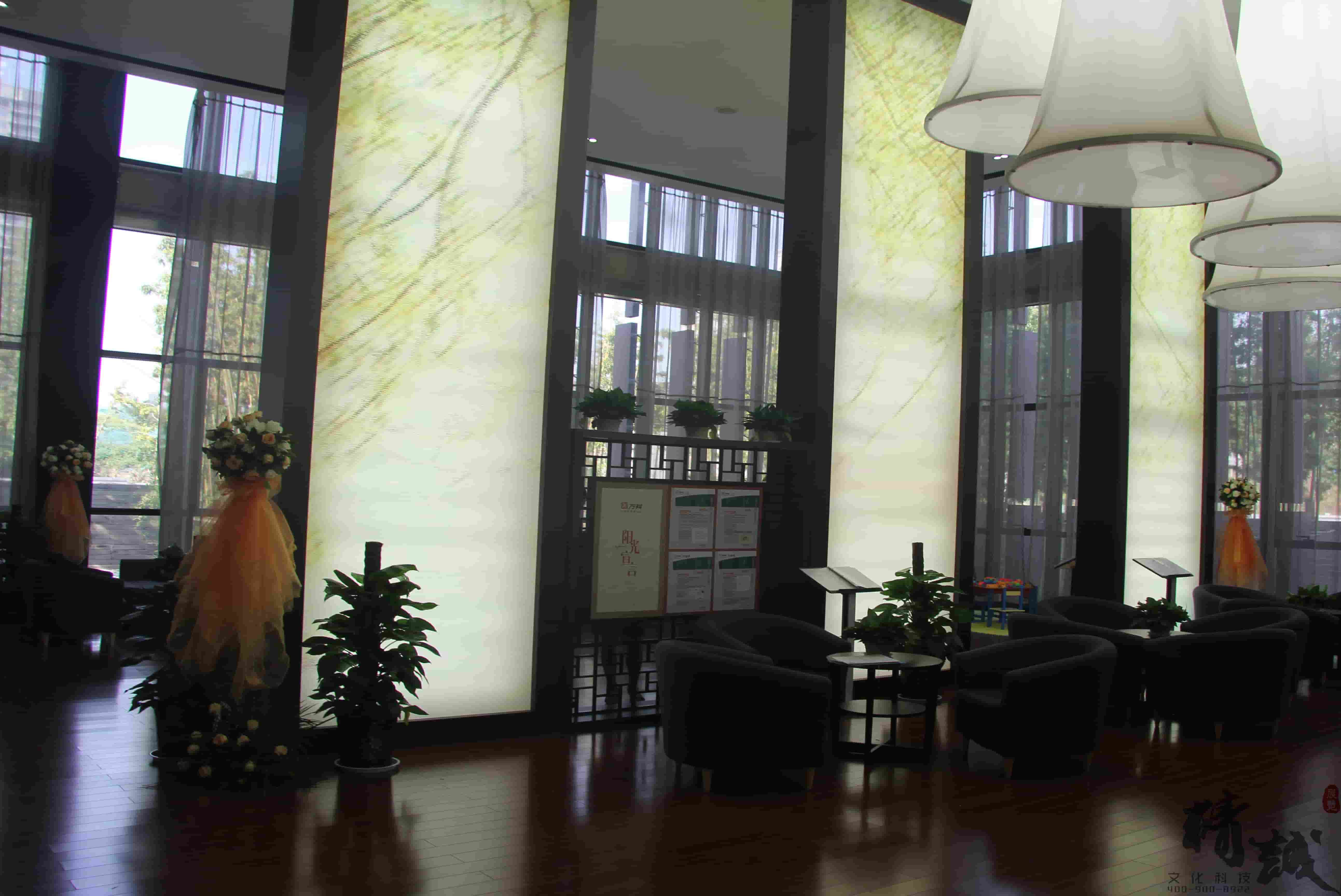 對(duì)于萬(wàn)科金域東郡的裝飾裝修設(shè)計(jì)整個(gè)展廳色調(diào)以穩(wěn)重的棕色為主,用適當(dāng)?shù)慕鹕鳛辄c(diǎn)綴,顯得整個(gè)展廳高端、大氣。大廳頂部懸掛的創(chuàng)意燈飾和墻面花語(yǔ)林鳥(niǎo)的燈光修飾,則為展廳帶來(lái)一絲清幽的新意,猶如清風(fēng)拂面。